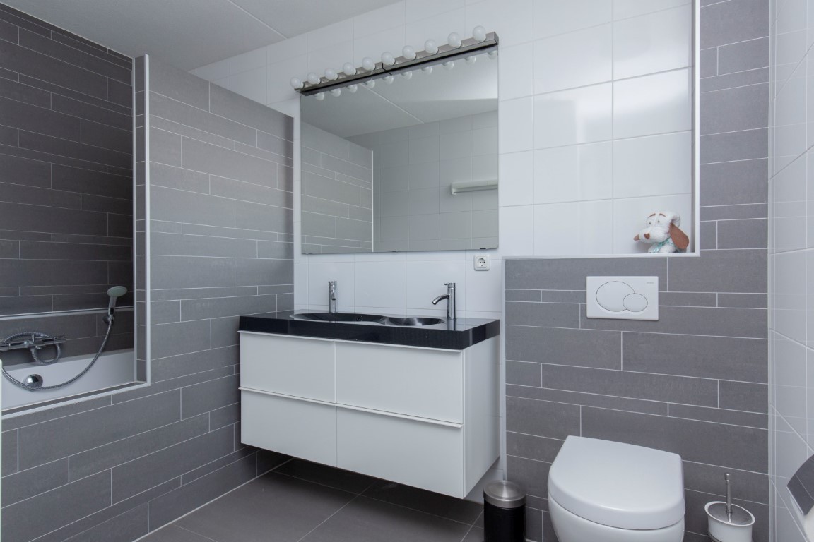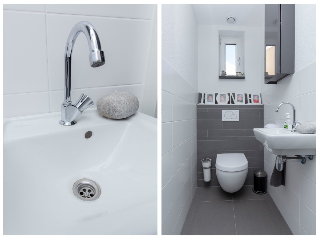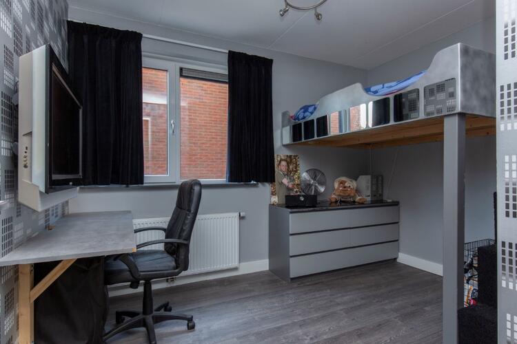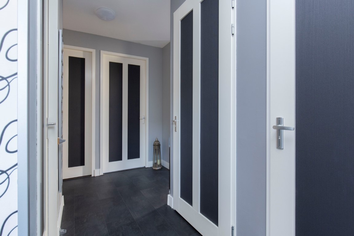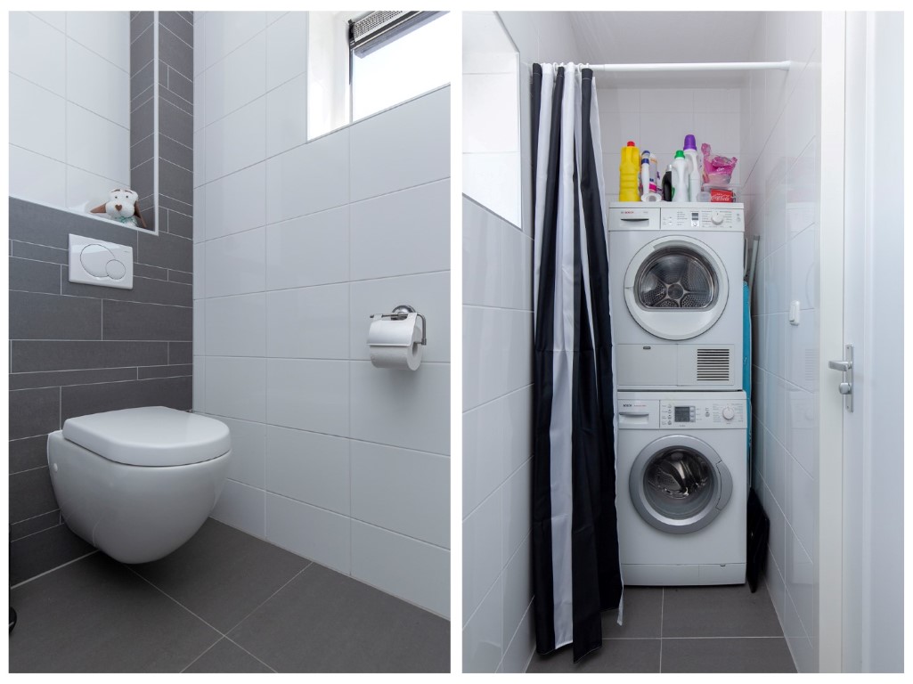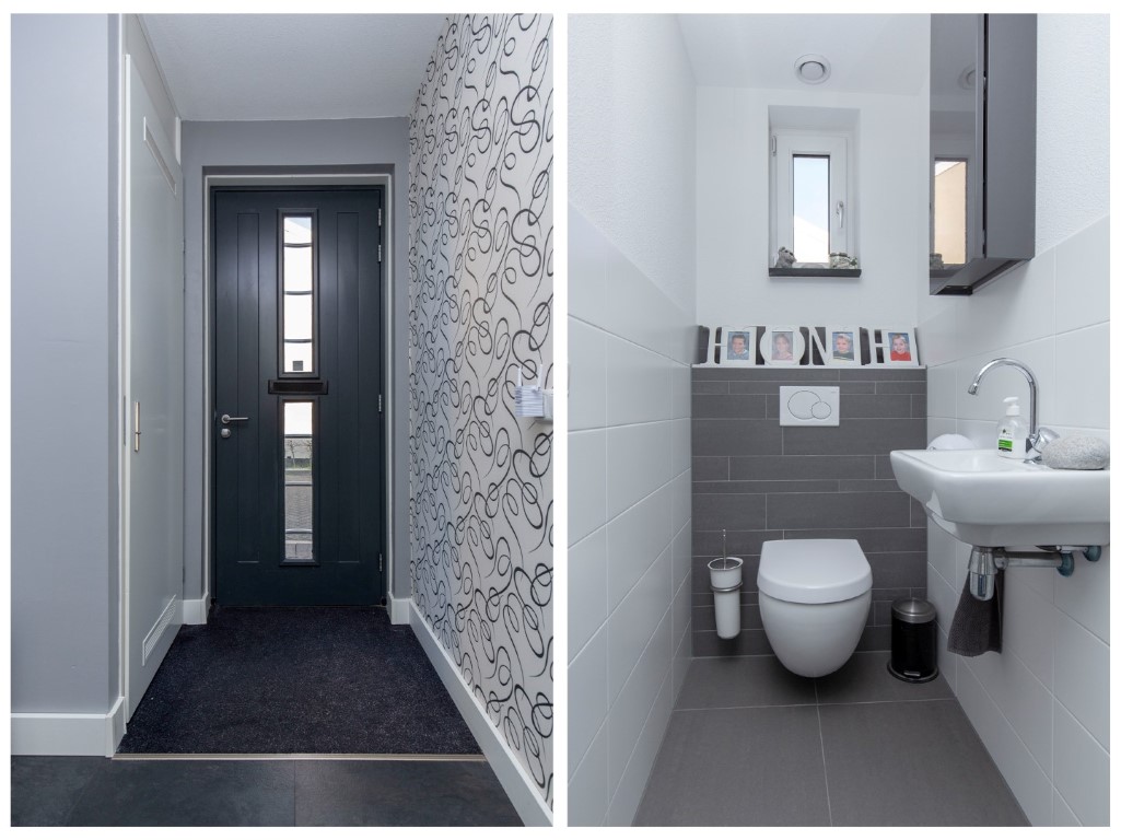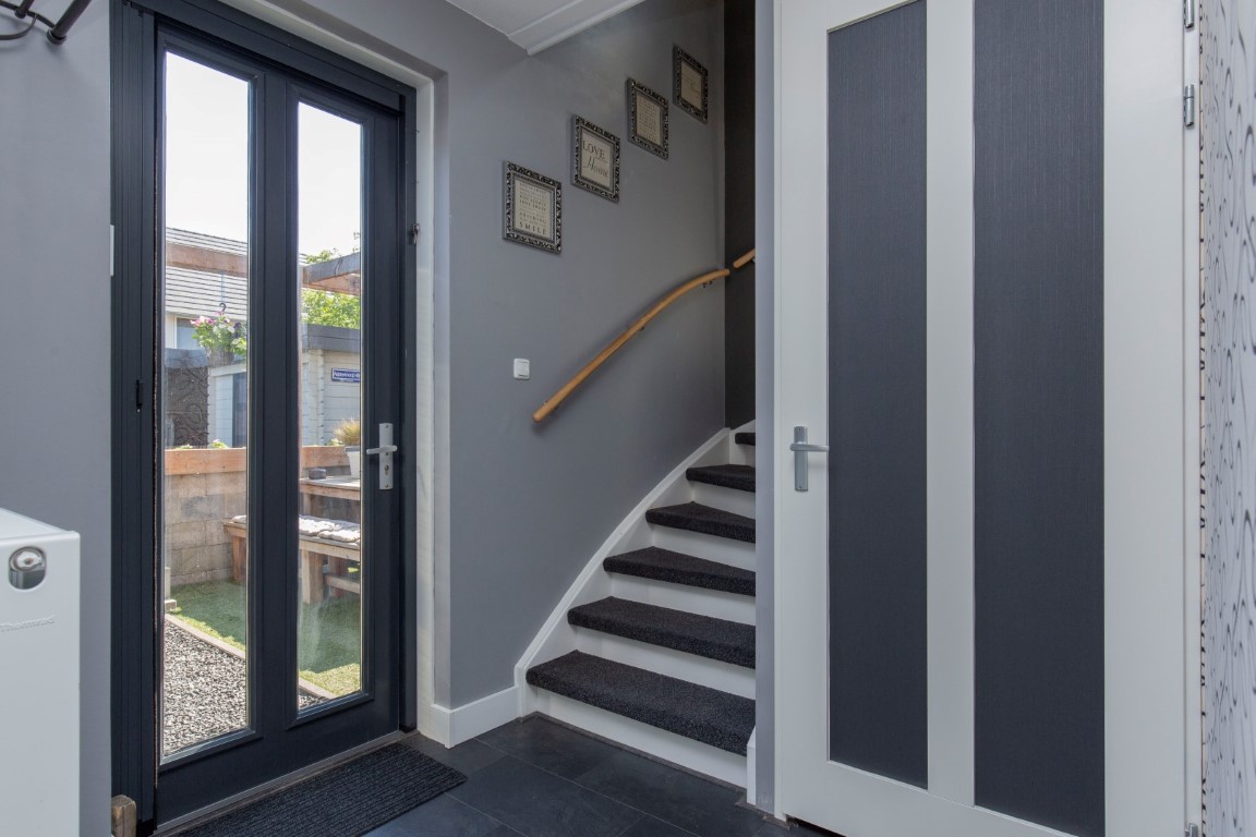 begane grond met de meterkast, toilet, ruime voorraadkast onder de trap, deur naar de achtertuin, badkamer voorzien van douche, dubbele wastafelmeubel en tegelwerk tot plafondhoogte, toegang tot 2 slaapkamers. De slaapkamer aan de voorzijde beschikt over een 2e deur dus u kunt met gemak hier een 3e slaapkamer maken. De tuin is gelegen op het zuid oosten.