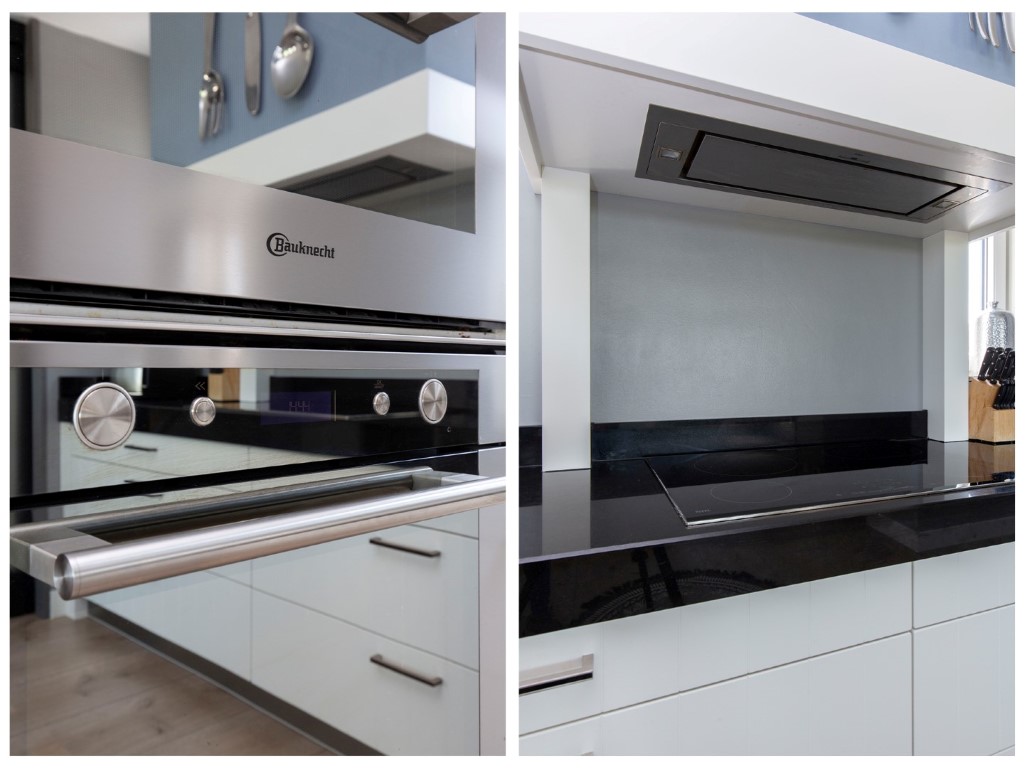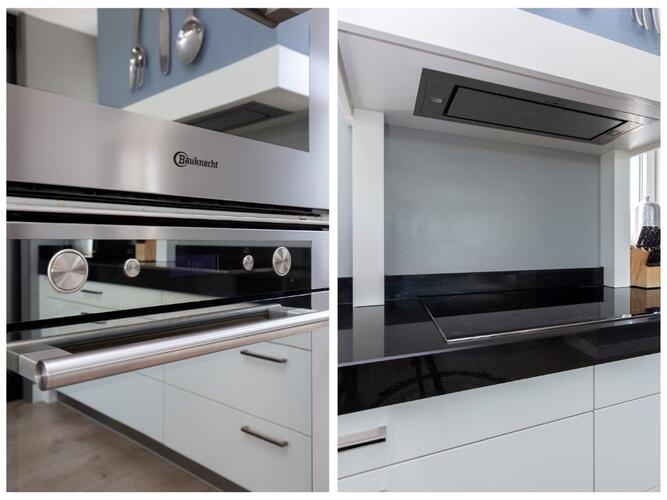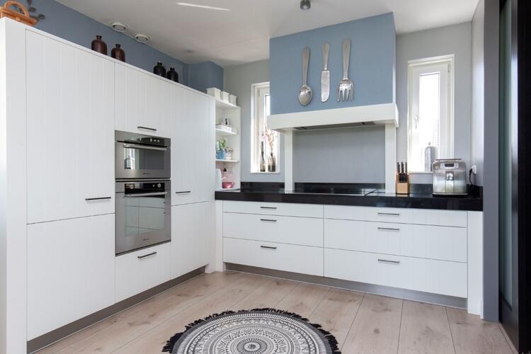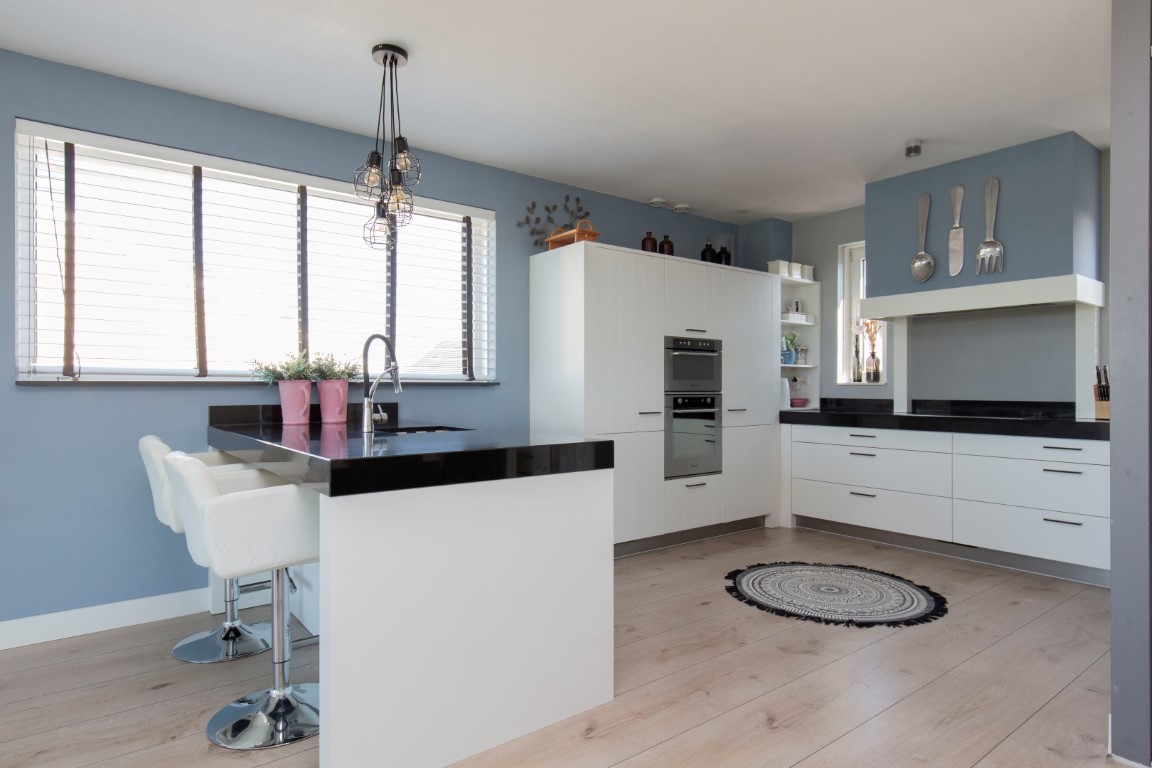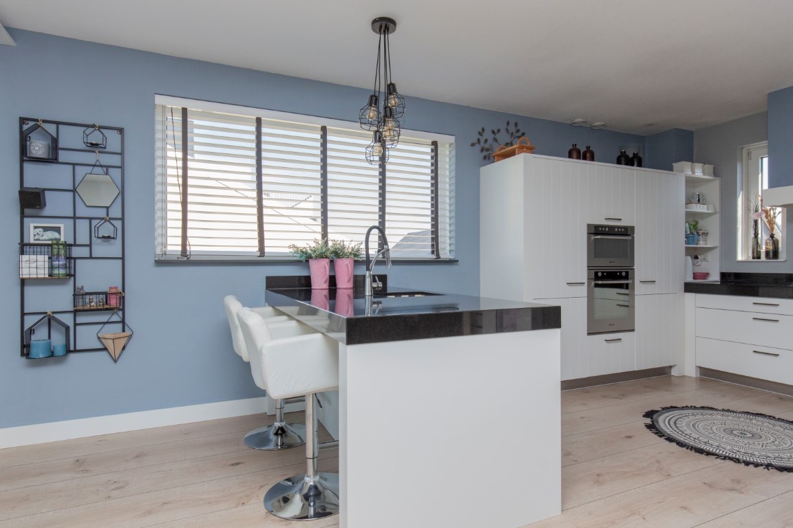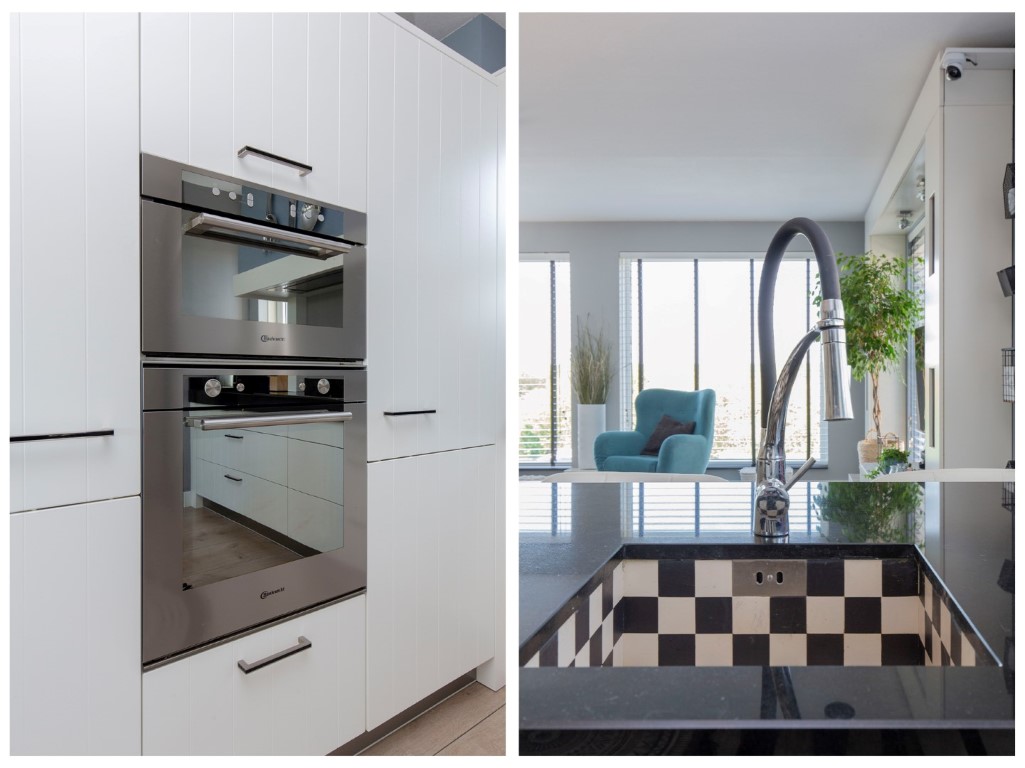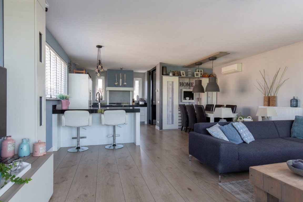 1e verdieping: overloop voorzien van schuifdeuren, ruime woonkamer met open keuken. De keuken is voorzien van een luxe L-vorm keukenblok met handige laden kasten, granieten werkblad, inductiekookplaat, Combi-magnetron, oven, afzuigkap met motor, een werkeiland met spoelbak en vaatwasser en een extra grote koelkast en vriezer. Aan de voorzijde is een grote woonkamer aanwezig met grote raampartijen. De woonkamer is voorzien van airco.
