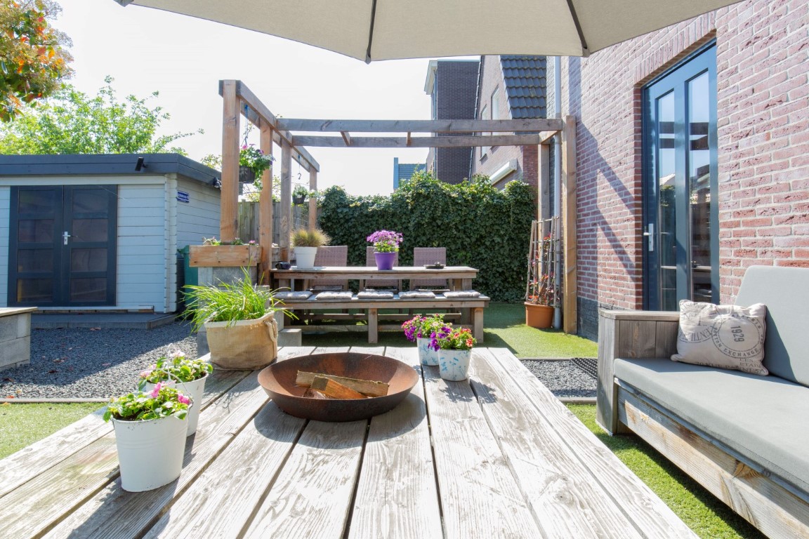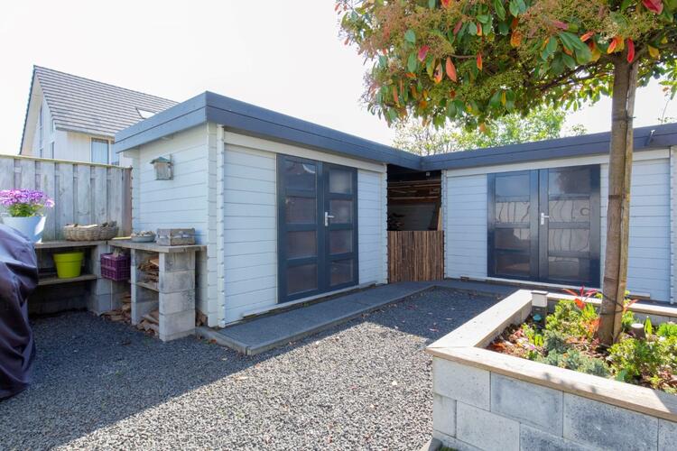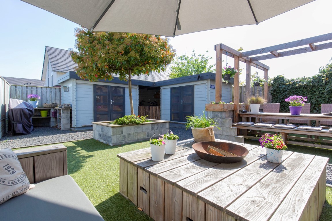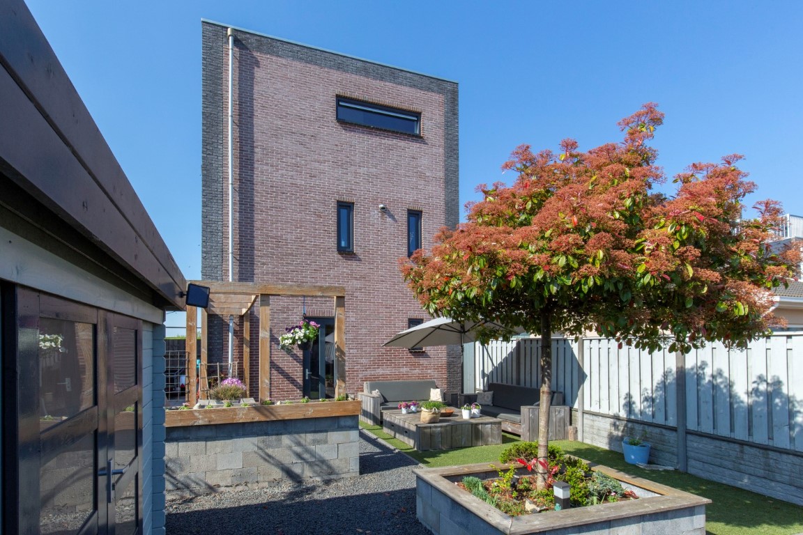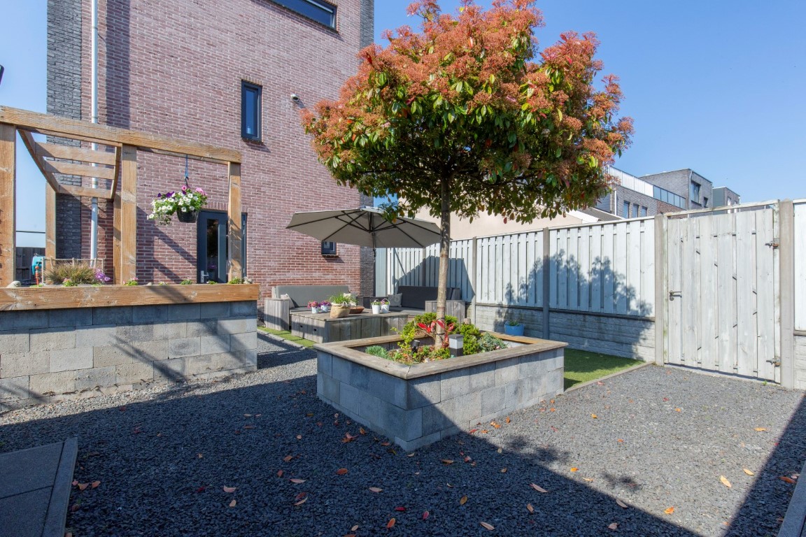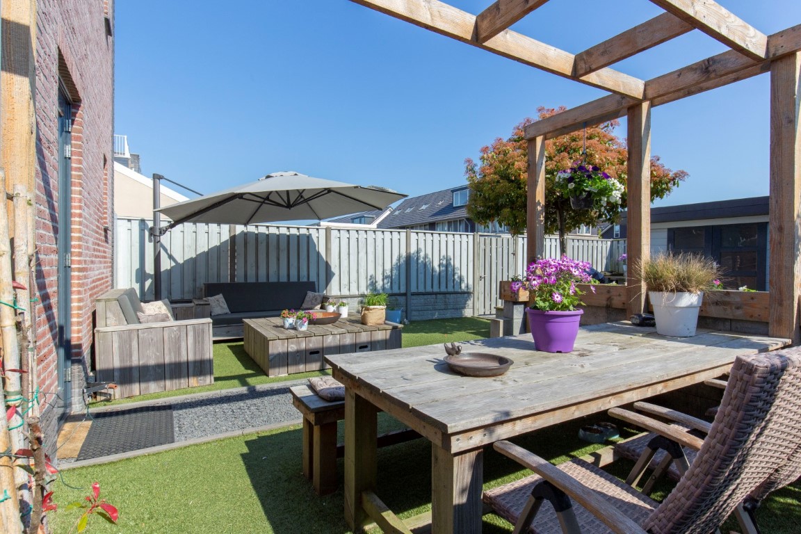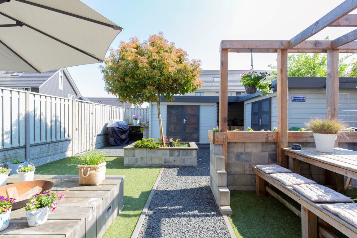 De tuin is keurig aangelegd met kunstgras, terras, diverse stroompunten, zij tuin en 2 houten bergingen die verbonden zijn middels een overkapping. De bergingen en overkapping zijn voorzien van meerdere stopcontacten. Aan de rechterzijde van de woning is een oprit aanwezig met afsluitbare dubbele poort. Dit is een ideale plek om uw motor of aanhanger te stallen. U kunt aan de voorzijde de auto op eigen terrein parkeren. De voortuin beschikt ook over diverse stroompunten (handig voor caravan, hogedrukspuit, (tuin)gereedschap, etc.). De zij tuin is voorzien van een vorstbestendige buitenkraan.