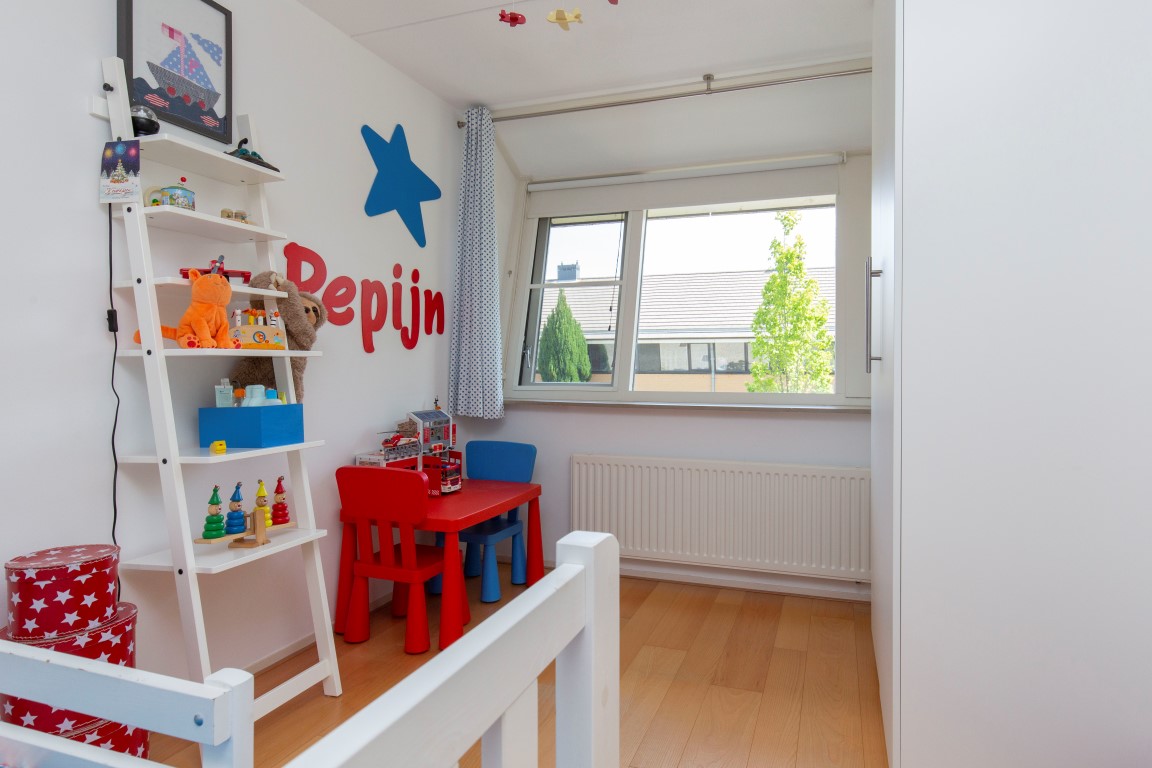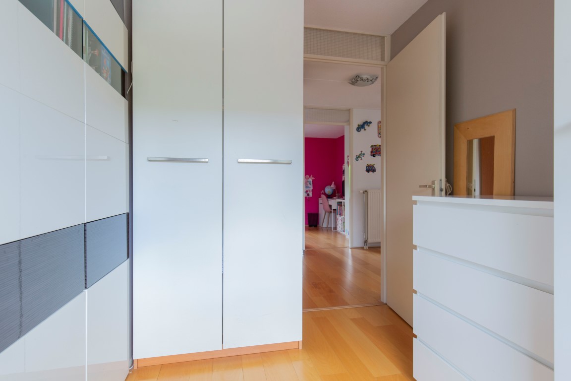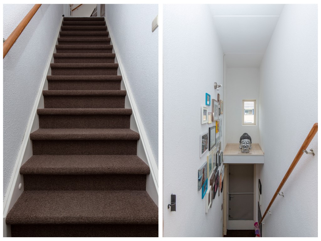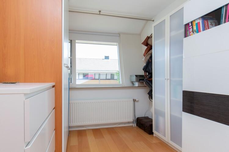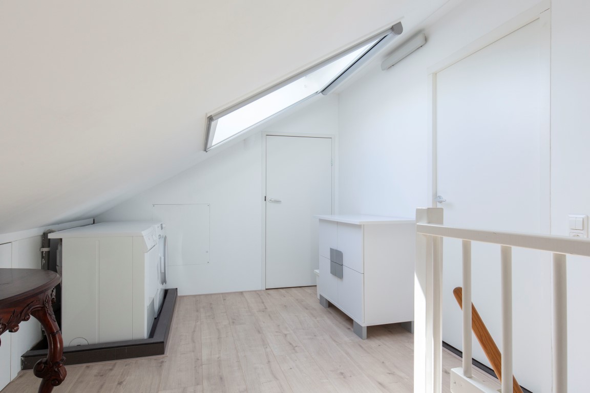 2e verdieping: vaste trap naar 2e verdieping met op de voorzolder een wasmachine aansluiting, Velux dakraam en bergruimte achter de knieschotten en een aparte cv ketel kast (Remeha 2010). De eigenaar heeft een kunststof dakkapel aan de achterzijde geplaatst met inbouwspots, kozijnen met draai-/kiepramen, horren en een een elektrisch rolluik. Hierdoor is een volwaardige grote ouderslaapkamer aanwezig op deze verdieping.