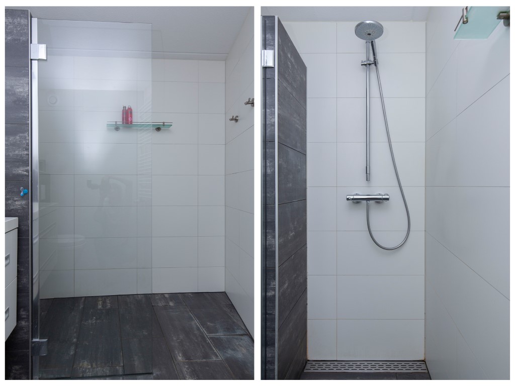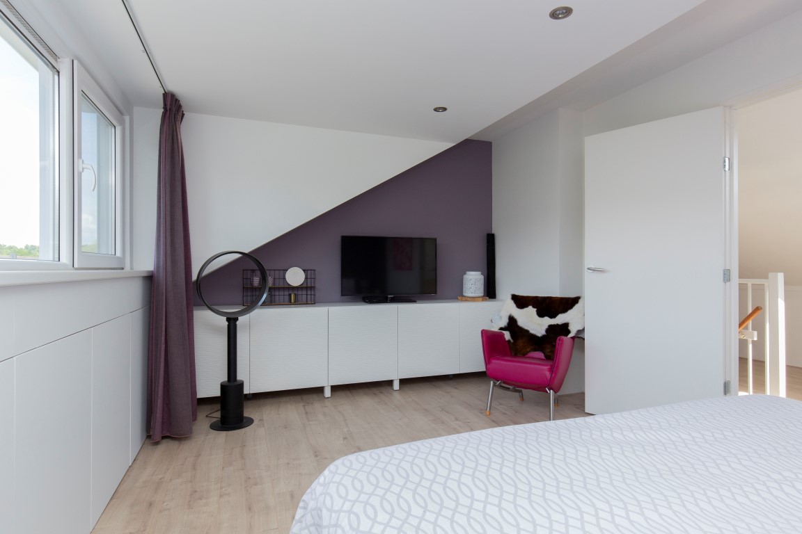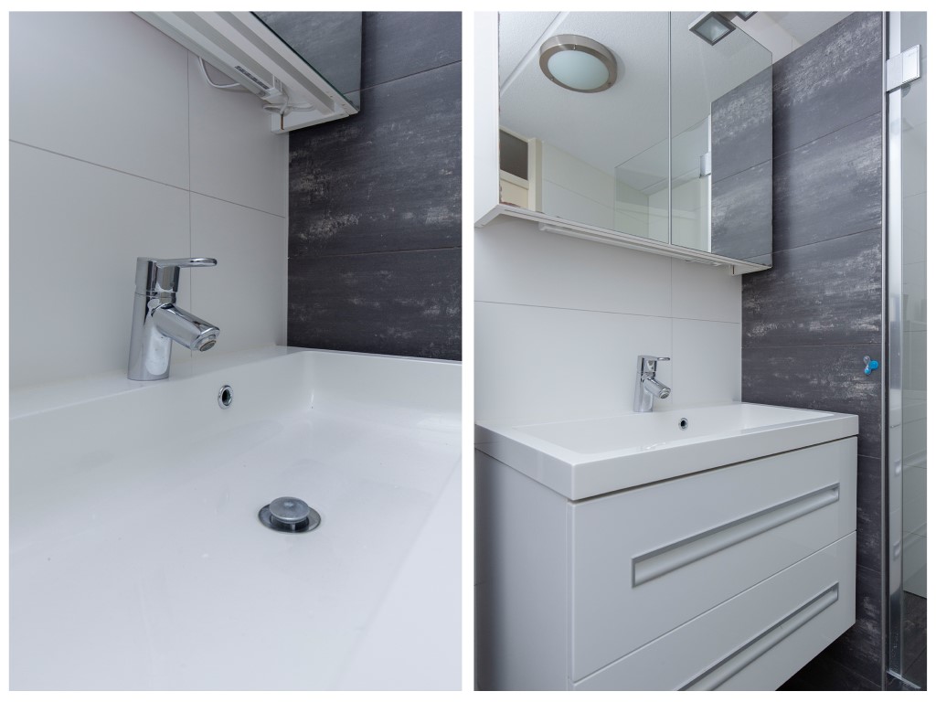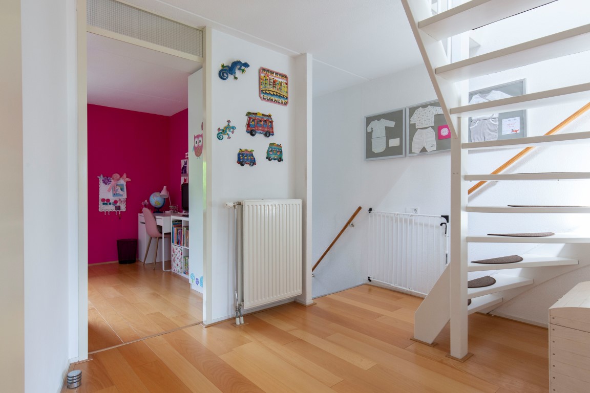 1e verdieping: ruime overloop met open trapopgang, toegang tot 3 slaapkamers en een inpandig gelegen badkamer. De badkamer is modern afgewerkt met onder andere een ruime inloopdouche, vrijhangend toilet, wastafelmeubel en handdoekradiator. Leuk detail is dat de ramen van de slaapkamers aan de voorzijde schuin staan.