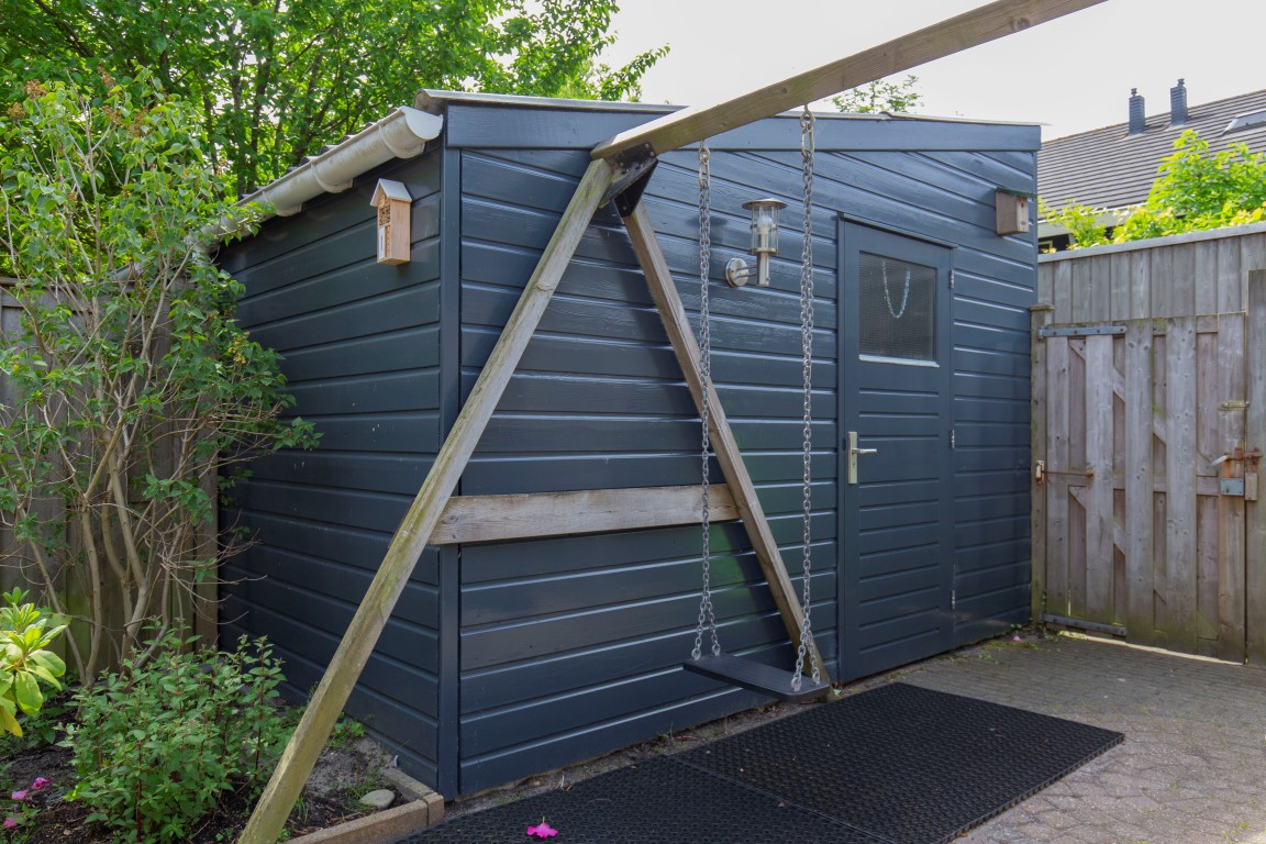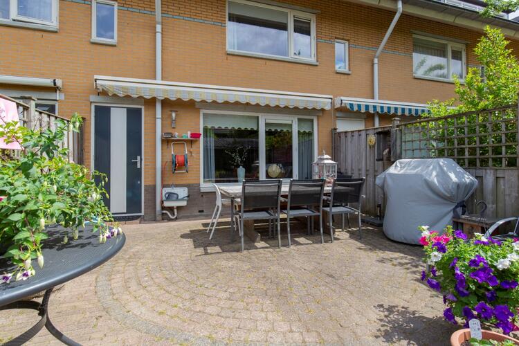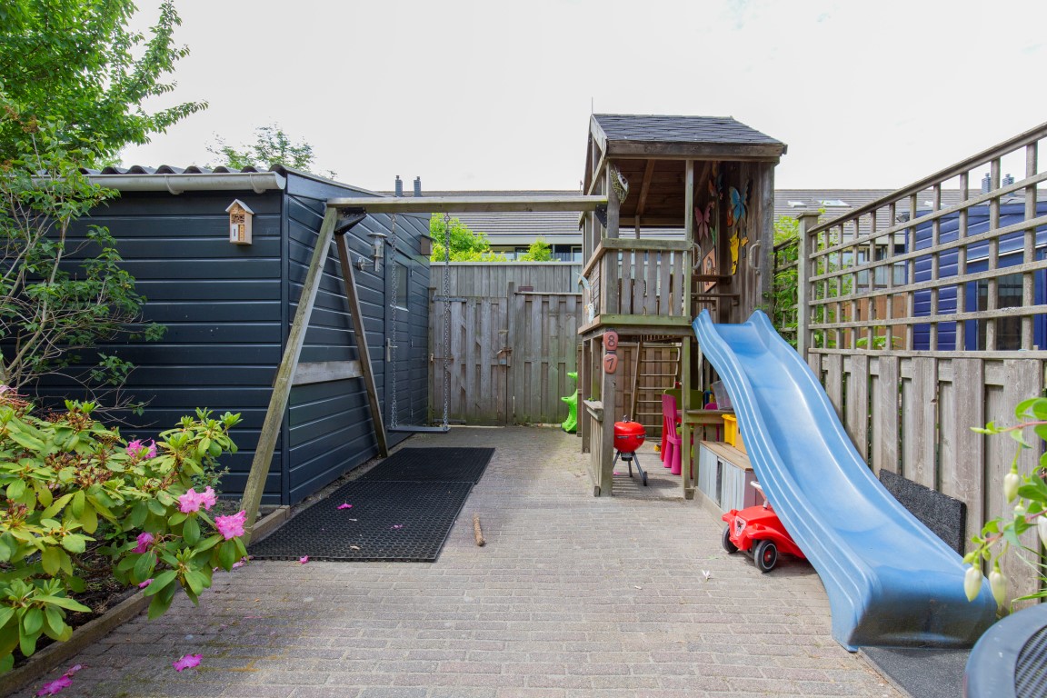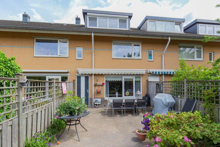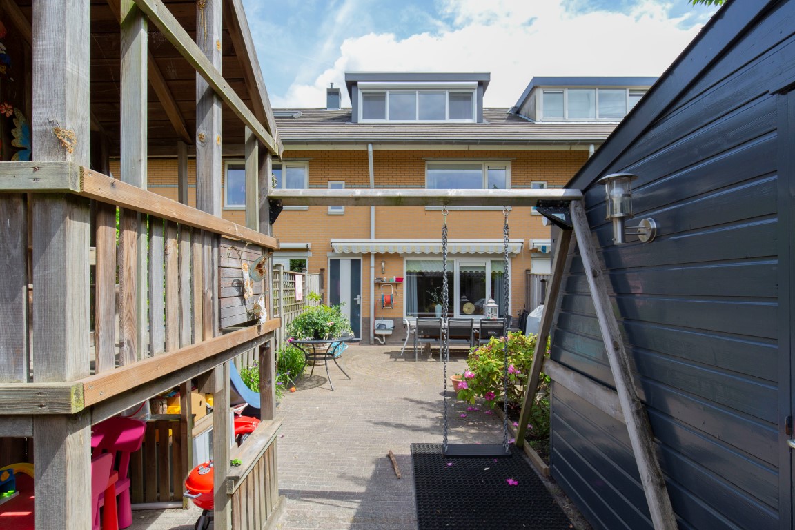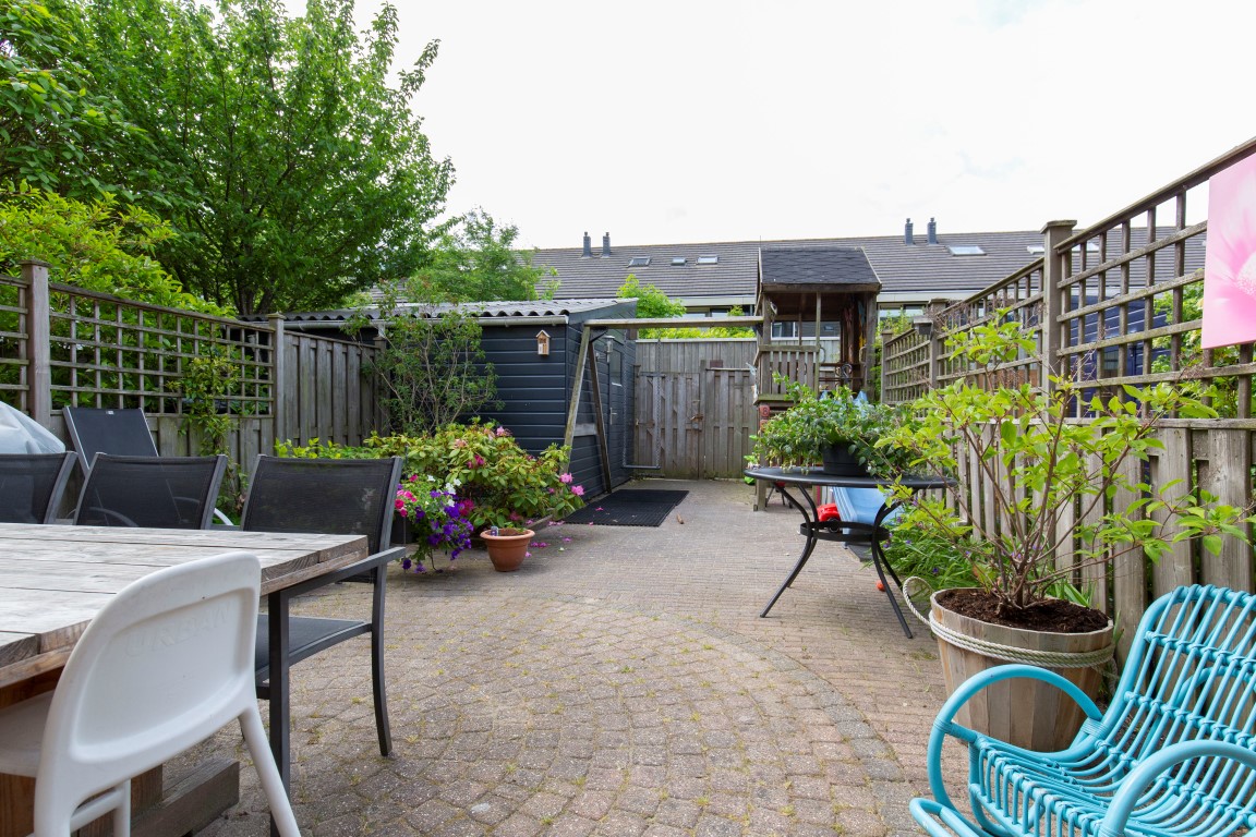 De achtertuin is keurig aangelegd en ligt perfect op de zon. De zon staat rond het einde van de ochtend tot en met de avond op het terras. De tuin is voorzien van sierbestrating, beplanting, buitenkraan, zonwering, schuttingen, houten ruime berging van 8m2 en eigen achterom.